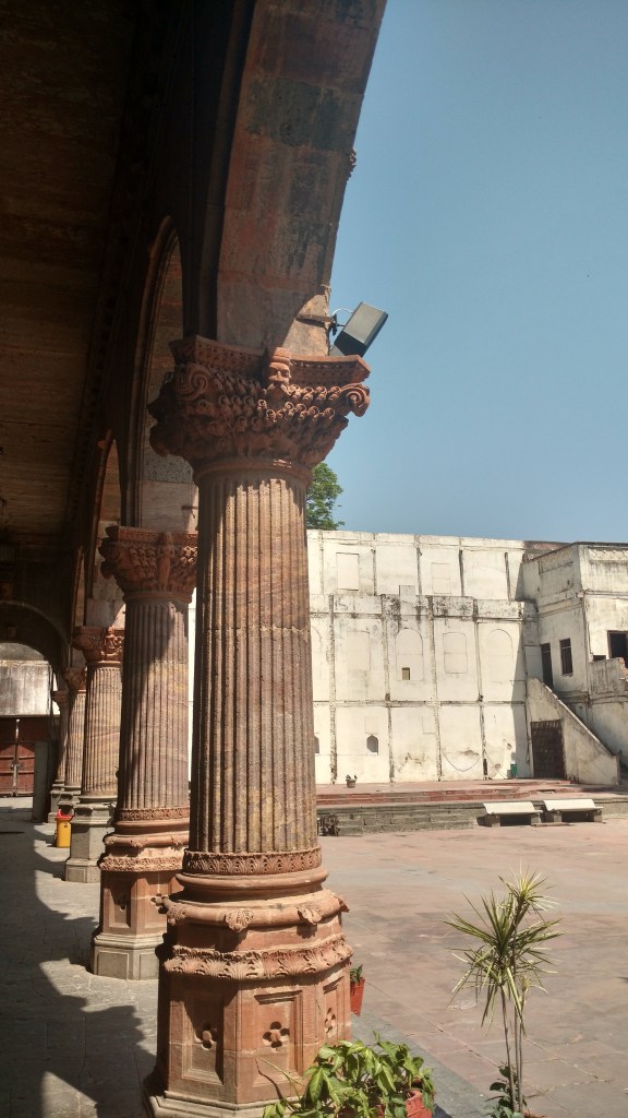 Now you are lost again, right? These long tunnels take you away from the sky line..the windows at intervals add a filtered light that pulls you deep inside. And in no time you forget the bright blue sky. These corridors envelop you warmly and the dramatic light that fall on slippery floors through arched wooden windows show you the mosaic dance. No sooner you forget to count how many windows did that magic with you, you land up to shake hands with the sky again….Yes you end up going to meet the skies again in huge courtyards. Here they stand between number of tall, dark and handsome escorts, overlooking them 24×7. Not just looking at them but also playing the game of light and shadows too. The columns…decorative and elegant, strong and proportionate. They hold the mighty arches and corridors, and above all, the giant palace. How they stand, as if marching around the courtyards…left right left..their shadows fall straight. Then above their heads are few more sets of corridors and breaking them in between are the faces of balconies rested on carved cornices.